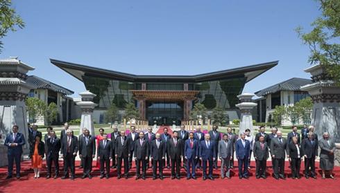 5月15日,“一帶一路”國際合作高峰論壇在北京雁棲湖國際會議中心舉行圓桌峰會,國家主席習近平主持會議并致辭。這是當天中午,習近平同與會領(lǐng)導人和國際組織負責人以國際會議中心“漢唐飛揚”主建筑為背景集體合影。(來源:新華網(wǎng))
