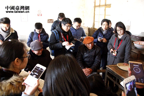 記者們在“當年農家”采訪“大包干”帶頭人嚴金昌(頭戴灰色小帽者)與當年一起“大包干”的農民(中國臺灣網 王鑫 攝)
