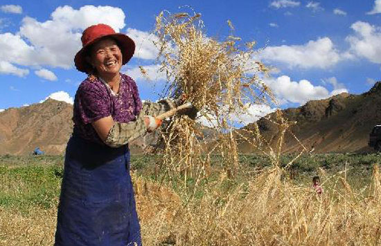 9月7日,西藏日喀則市甲措雄鄉塔康村村民次白吉珍在收割青稞。