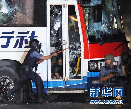 8月23日,在菲律賓馬尼拉,警察試圖打開被劫持旅游車的車門。新華社/法新