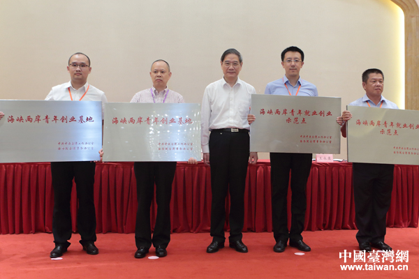 張志軍向新設(shè)的20個(gè)海峽兩岸青年創(chuàng)業(yè)基地和11個(gè)海峽兩岸青年就業(yè)創(chuàng)業(yè)示范點(diǎn)授牌。(中國(guó)臺(tái)灣網(wǎng) 于斯文 攝)