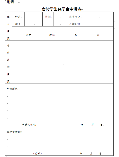 臺灣學生根據(jù)上述獎學金申請條件,按學年向所在學校或科研院所提出申請,提交《臺灣學生獎學金申請表》(見附表)。獎學金每學年評選一次,符合條件的學生可連續(xù)申請。