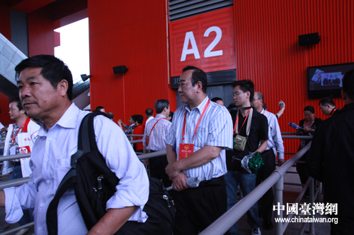 近150位海外統促會會長今日在滬參觀了上海世博會,圖為會長們排隊等候參觀中國國家館。(中國臺灣網 楊麗 攝)