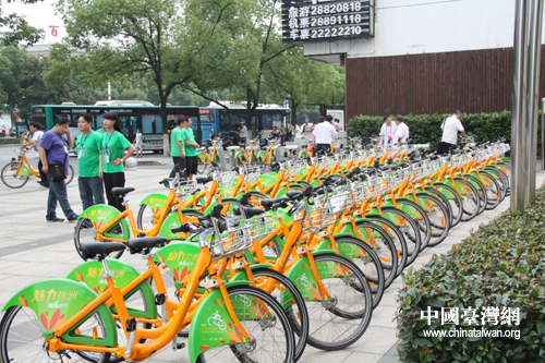 一排排的綠色自行車成為了株洲市區的一道亮麗風景。(中國臺灣網 王君飛 攝)