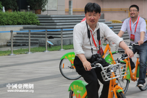 株洲在居民區、主次干道、交通樞紐、公共場所、公園景區等地,規劃建設502個公共自行車租賃點。圖為考察團成員親自騎車體驗。(中國臺灣網 王君飛 攝)