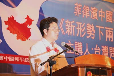 鄧代辦首先感謝菲律賓和統會組織此次講座,并表示,臺灣問題關系到中國統一大業,關系到中國人民的核心利益和海外炎黃子孫的民族感情。從1979年全國人大葉劍英委員長的告臺灣同胞書,到今年元旦胡錦濤主席的最新講話,都體現了中國政府以最大誠意、盡最大努力解決臺灣問題的決心。鄧表示,2008年以來,臺海地區形勢發生了有利于兩岸關系緩和的積極變化。新形勢下兩岸關系如何發展,新形勢下廣大海外華人華僑的反“獨”促統工作如何推進,這是包括菲律賓在內的全世界華夏兒女共同關心的大事。相信專家的講座對于廓清2008年臺灣地方政府更迭后的兩岸關系,厘清對新形勢下兩岸關系的認識,推進菲律賓地區反“獨”促統工作都會是非常有益的。
