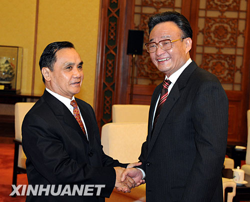 3月24日,全國人大常委會委員長吳邦國在北京人民大會堂會見老撾國會主席通辛·坦馬馮。 新華社記者黃敬文攝