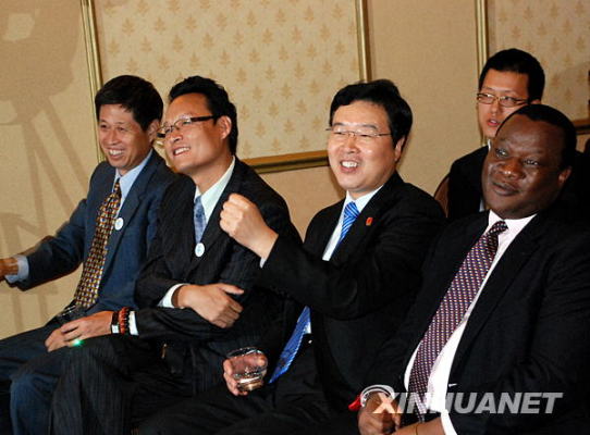 1月21日,在南非首都約翰內斯堡,中國駐約翰內斯堡總領事房利(右二)為世博會加油。