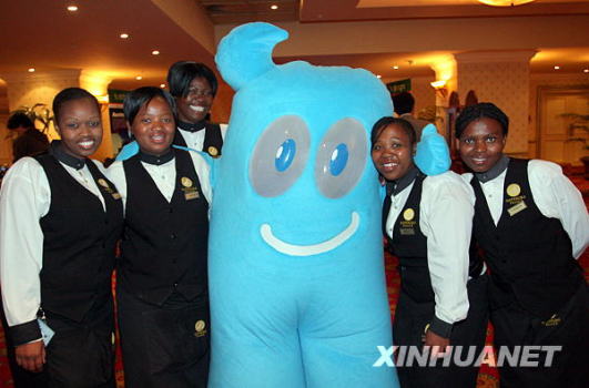 1月21日,在南非首都約翰內斯堡,幾名當地青年與上海世博會吉祥物“海寶”合影。新華社發(梁銓攝)
