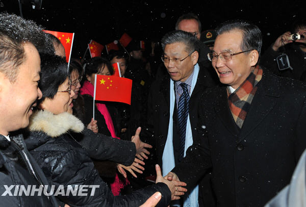 12月16日,中國(guó)國(guó)務(wù)院總理溫家寶抵達(dá)丹麥?zhǔn)锥几绫竟鱿绫竟鶜夂蜃兓瘯?huì)議。這是溫家寶受到當(dāng)?shù)厝A僑華人和留學(xué)生代表的熱烈歡迎。新華社記者武巍攝