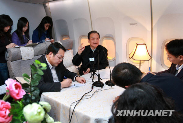 12月16日,中國(guó)國(guó)務(wù)院總理溫家寶抵達(dá)丹麥?zhǔn)锥几绫竟鱿绫竟鶜夂蜃兓瘯?huì)議。這是溫家寶在專機(jī)上接受隨行記者采訪。新華社記者龐興雷攝