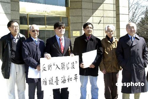 3月13日,大華盛頓僑領張文健、吳惠秋、沈己堯等代表大華府地區120多家華人社團組織,來到位于華盛頓的臺北駐美經濟文化代表處樓前,抗議臺灣當局入聯公投,據介紹,華人社團將聯合在當地報紙上刊登反“入聯公投”的大幅廣告。圖為僑領們在臺北駐美代表處大樓前打出反“公投”標語。