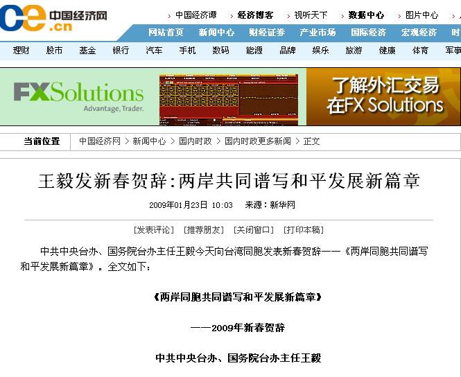我們真誠希望,兩岸協商取得新的成果,在直接“三通”基本實現基礎上,深化產業合作,啟動金融合作,克服金融海嘯帶來的沖擊,推進兩岸經濟關系正常化、合作制度化。