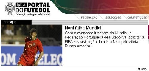 納尼上周五在里斯本訓練時左肩受傷,隨后雖然和國家隊一起飛到南非,但持續一段時間的左肩的肩傷一直無法正常參加訓練。雖然納尼對于自己的肩傷恢復很樂觀,但周二上午經過球隊醫療專家的再次確診,確認納尼的傷勢將無法承受世界杯期間的比賽需要。曼聯邊鋒將不得不離開南非,回國進行進一步治療。葡萄牙隊的隊醫:“經過檢查后我們確認他無法及時恢復參加世界杯。”