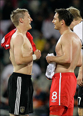 之后,施魏因斯泰格就赤裸著上身沖向了看臺上的女友,并將蘭帕德的球衣給了她,于是賽后人們看到了“小豬”女友穿著英格蘭紅色8號的奇怪一幕。不過,據說周圍的德國球迷為這一幕大聲鼓掌叫好。