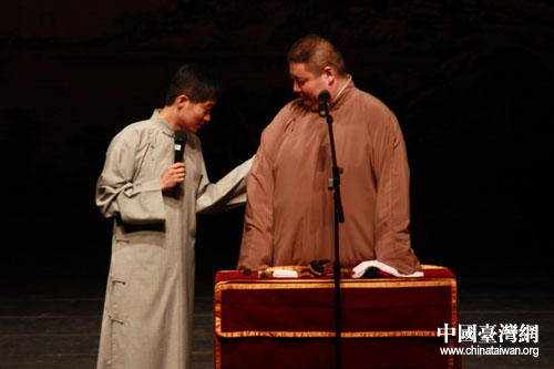 中國(guó)臺(tái)灣網(wǎng)5月18日嘉義消息 5月17日晚上,嘉義縣表演藝術(shù)中心迎來(lái)了“第十一屆京味文化——臺(tái)灣嘉義親情之旅”一行的表演藝術(shù)家、工藝美術(shù)大師們。應(yīng)寧、王磊表演的《雙簧》,何云偉、李菁帶來(lái)的《學(xué)啞語(yǔ)》,李偉建、武賓經(jīng)典段子《咨詢熱線》,以及由臺(tái)北曲藝團(tuán)帶來(lái)的快板《雙鎖山》,相聲《地理圖之阿寶要脫團(tuán)》,讓當(dāng)晚嘉義縣表演藝術(shù)中心的觀眾從頭笑到尾。(記者 董潔 圖/文)