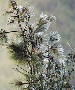 一早車過合歡山,樹上還看得到殘留融化了的水漬,原來濕氣不足的水氣,碰上夜晚冷冽的寒風,仍在樹上結了一層薄冰。