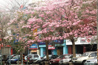頭份中華路花朵成開(kāi),像似北國(guó)的櫻花,但附近商店住家和行人,沒(méi)有人喊得出它的樹(shù)種和名稱,仍待專家指點(diǎn)。