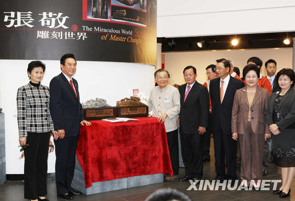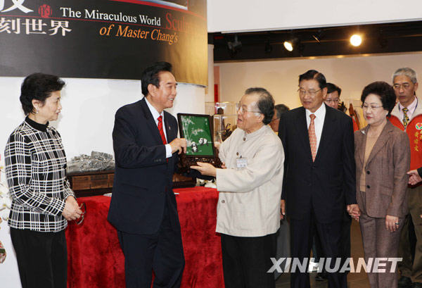 12月23日,海協會會長陳云林(左二)在參觀木雕作品后與雕刻大師張敬互換紀念品。