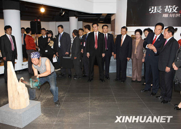 當日,剛剛結束兩會第四次領導人會談的海協會會長陳云林在海基會董事長江丙坤的陪同下,在苗栗縣參觀三義木雕博物館。新華社記者 袁滿 攝