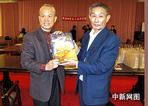 兩岸交流日趨熱絡廣泛,內蒙古文藝參訪團近日應臺北市藝文家協會的邀請來臺參訪。圖為參訪團團長、內蒙古阿拉善盟慈善協會名譽主席鐵木爾巴圖(右)在臺北陽明山中山樓向臺灣著名微雕家陳逢顯致贈介紹阿拉善盟風光的雜志。