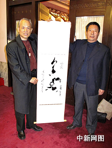 圖為參訪團成員、內蒙古阿拉善盟文聯主席李凌山(右)在臺北陽明山中山樓向臺灣著名微雕家陳逢顯致贈用蒙古文書寫的書法“福運”。陳立宇攝