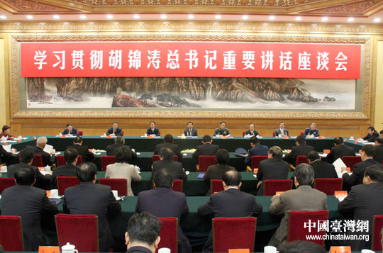 中臺辦、國臺辦等單位30日下午在京舉行學習貫徹胡錦濤總書記去年底對臺重要講話座談會。中共中央政治局常委賈慶林出席并講話。(中國臺灣網 鐘寶華 攝)