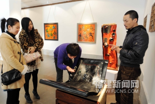 1月4日,近百件樸實(shí)典雅、深沉蘊(yùn)蓄,文人韻味濃郁且出自閩臺藝術(shù)家之手的漆藝、壽山石雕精品,亮相在福州舉行的《中國漆與壽山石》主題藝術(shù)展 ,吸引不少年輕觀眾的目光。列入第一批國家級非物質(zhì)文化遺產(chǎn)名錄的漆藝和壽山石雕,是福州非物質(zhì)文化遺產(chǎn)的代表性門類。(記者 劉可耕 攝)