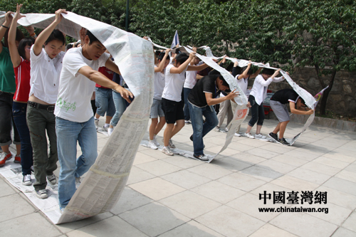 中國臺灣網8月18日太原消息 18日上午,臺灣青年交流團一行來到了位于山西太原的中北大學,和這所高校的青年學生開展交流活動。沒有座談會式的相互介紹,沒有導游式的校園介紹,一項考驗團隊協作、溝通、互動的拓展訓練使兩岸青年在比賽中相識,在協作中相知,在勝利時相擁。