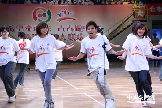中國臺灣網7月15日北京消息  昨晚,“青春牽兩岸,十年大聚首——京臺青少年交流周”暨兩岸青年大聯歡活動在北京大學生體育館隆重舉行。來自臺灣大學、臺中技術學院、屏東商業技術學院、基隆市二信中學、嘉義東石學校、新竹中信學校和國民黨青年發展基金會、臺灣工藝發展協會、周文鏡文教基金會、臺中中小企業協會等社會團體組織的600余名臺灣師生與北京師生歡聚在一起,度過了難忘的一晚。
