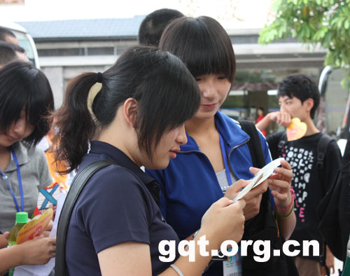剛剛交換過結對卡的漳州三中的莊周潔(左)和臺灣華僑高中的吳欣潔正在互相介紹自己。中國共青團網記者悅丹攝影