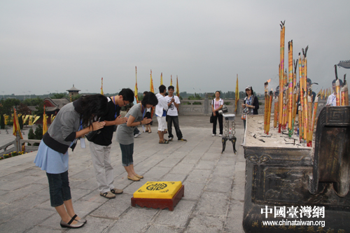 祭奠廣場前,團員們正在上香拜祭祖先(中國臺灣網 陳寧 攝) |