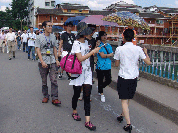 華夏經緯網714日訊:第九屆“湖湘文化之旅”參訪團今天來到懷化市芷江侗族自治縣參觀考察,兩岸大學生參觀了龍津風雨橋、天后宮、飛虎隊紀念館以及中國人民抗日戰爭勝利受降舊址等。