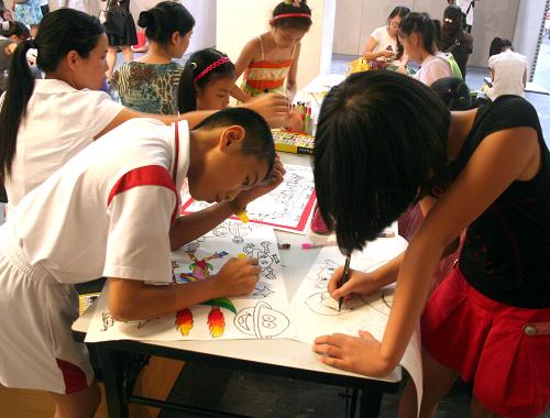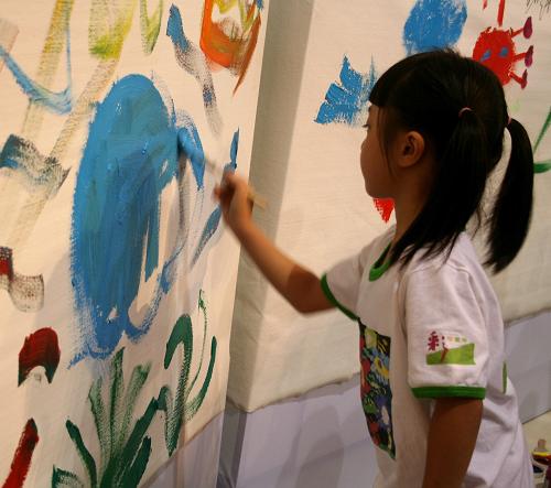 7月26日,小朋友在“首屆海峽兩岸少年兒童美術大展”開幕式現(xiàn)場作畫。新華社記者 袁卿 攝