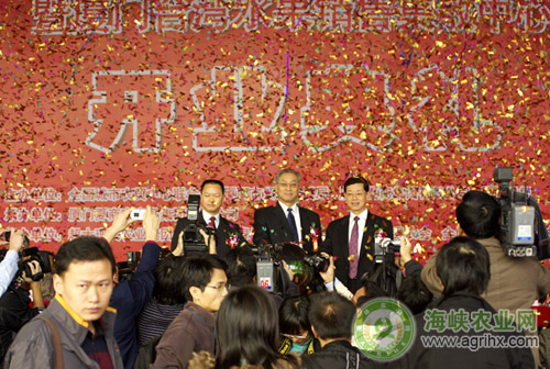 廈門市委副書記陳炳發(右一)、海峽兩岸關系協會副會長張銘清(中)、商務部駐福州特辦特派員曹宏瑛共同為啟動首屆臺灣水果訂貨會