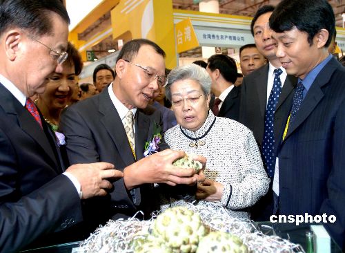 “海峽兩岸農業(yè)成果展覽暨項目推介會”10月19日在廈門舉行。參展的臺灣客人向國務院副總理吳儀介紹水果新品。吳儀表示,兩岸農業(yè)合作成果展介會是兩岸多年來農業(yè)合作成果的集中展示,也是為兩岸同胞交流搭建的新平臺,這必將為深化兩岸農業(yè)合作交流創(chuàng)造更多更好的契機。中新社發(fā) 鄭祚聲 攝