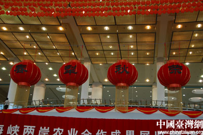 海峽兩岸農業(yè)合作成果展覽暨項目推介會今天(19日)上午在廈門開幕。整個會場融入中國的傳統(tǒng)元素,包括中國傳統(tǒng)的對聯(lián)、燈籠,此外結合本次兩岸農業(yè)合作論壇的主題,凸現(xiàn)農業(yè)特色(云鵬/攝影)
