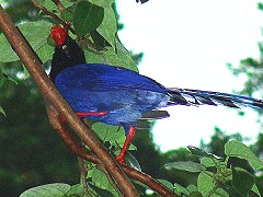 “臺灣藍鵲”為臺灣地區特有,與烏鴉同屬鴉科,叫聲同樣沙啞,羽色卻與烏鴉迥然不同,亮麗無比。頭、臉、頸、喉、胸都是黑色,黃色的眼珠包圍黑色的瞳孔,鮮紅色的鳥喙、雙腳,身體上半部可目視處及下半部的腹部呈鮮藍色,尾下覆羽則為白色,有十二根尾羽,最長二羽為藍根白尾,其于為黑根白尾,左右對稱。尾羽長占了總體長的三分之二,飛行時總以直線前進,非常優雅高貴。