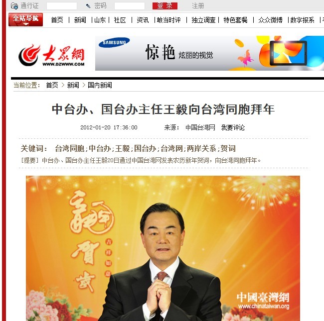 1月20日,中臺辦、國臺辦主任王毅通過中國臺灣網發表農歷新年賀詞,向臺灣同胞拜年。(中國臺灣網 田云鵬 攝)