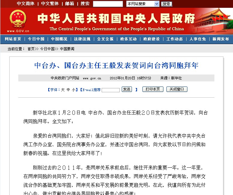 剛剛過去的2011年,是兩岸關(guān)系承前啟后,繼往開來的重要一年。這一年里,在兩岸同胞的共同努力下,兩岸交往取得豐碩成果,兩岸關(guān)系經(jīng)受了嚴(yán)峻考驗(yàn),兩岸交流合作的基礎(chǔ)更加牢固,兩岸關(guān)系和平發(fā)展的前景更趨光明。在此,我謹(jǐn)向所有為此付出心血、做出貢獻(xiàn)的臺(tái)灣各界同胞致以最衷心的感謝!