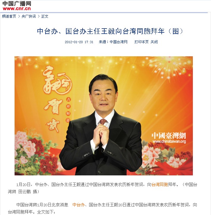 中臺辦、國臺辦主任王毅20日發表農歷新年賀詞,向臺灣同胞拜年。全文如下: