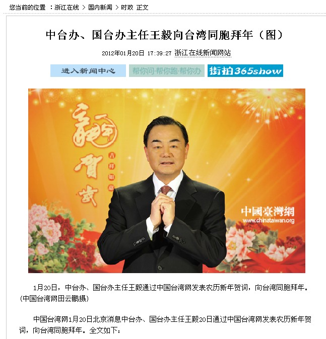 [浙江在線] 中臺辦、國臺辦主任王毅向臺灣同胞拜年
