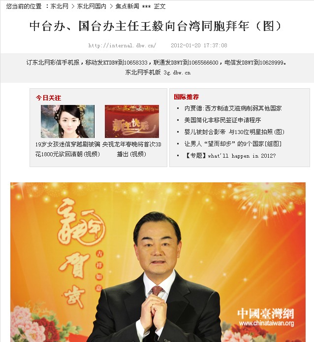 剛剛過去的2011年,是兩岸關系承前啟后,繼往開來的重要一年。這一年里,在兩岸同胞的共同努力下,兩岸交往取得豐碩成果,兩岸關系經受了嚴峻考驗,兩岸交流合作的基礎更加牢固,兩岸關系和平發展的前景更趨光明。在此,我謹向所有為此付出心血、做出貢獻的臺灣各界同胞致以最衷心的感謝!