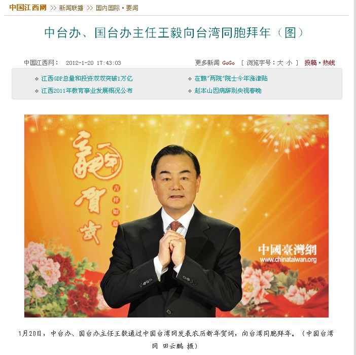 [中國江西網] 中臺辦、國臺辦主任王毅向臺灣同胞拜年