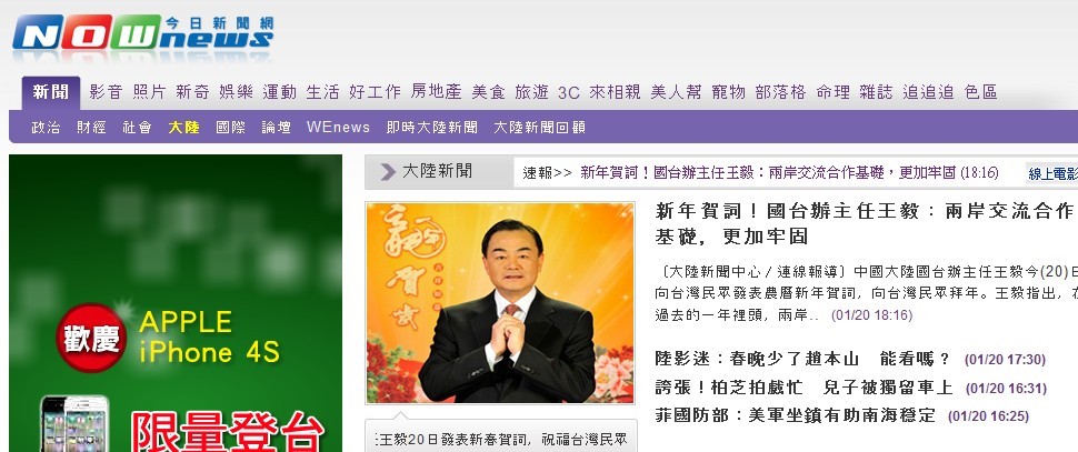 中國大陸國臺辦主任王毅今(20)日向臺灣民眾發表農歷新年賀詞,向臺灣民眾拜年。王毅指出,在過去的一年里頭,兩岸交往取得豐碩成果,兩岸交流合作的基礎更加牢固,兩岸關系和平發展的前景更趨光明。王毅也祝福臺灣民眾,「新春快樂,龍年大吉!」
