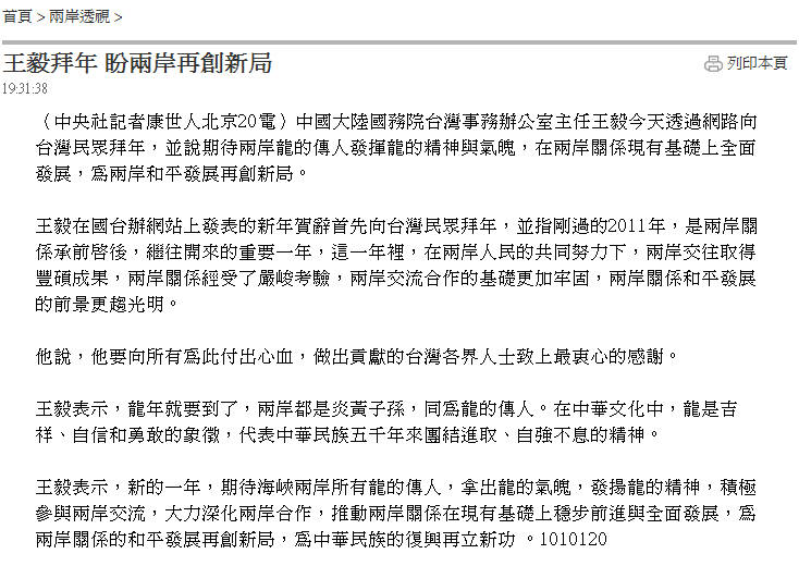 王毅在國臺辦網站上發表的新年賀辭首先向臺灣民眾拜年,並指剛過的2011年,是兩岸關係承前啟後,繼往開來的重要一年,這一年裏,在兩岸人民的共同努力下,兩岸交往取得豐碩成果,兩岸關係經受了嚴峻考驗,兩岸交流合作的基礎更加牢固,兩岸關係和平發展的前景更趨光明。