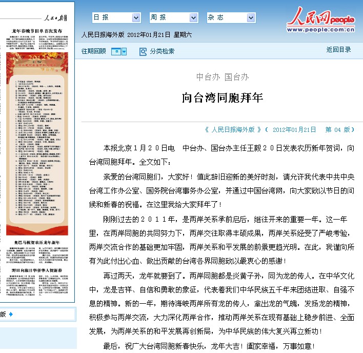 剛剛過去的2011年,是兩岸關(guān)系承前啟后,繼往開來的重要一年。這一年里,在兩岸同胞的共同努力下,兩岸交往取得豐碩成果,兩岸關(guān)系經(jīng)受了嚴峻考驗,兩岸交流合作的基礎(chǔ)更加牢固,兩岸關(guān)系和平發(fā)展的前景更趨光明。在此,我謹向所有為此付出心血、做出貢獻的臺灣各界同胞致以最衷心的感謝!