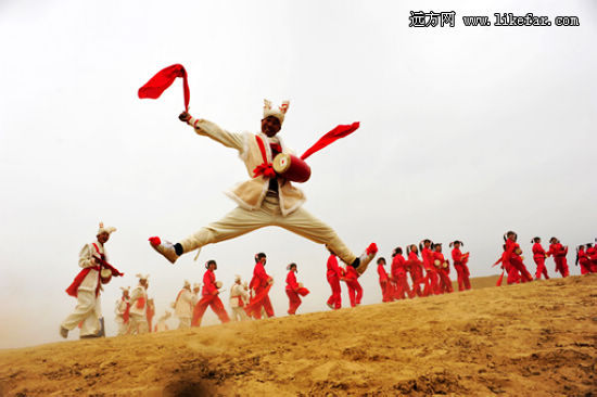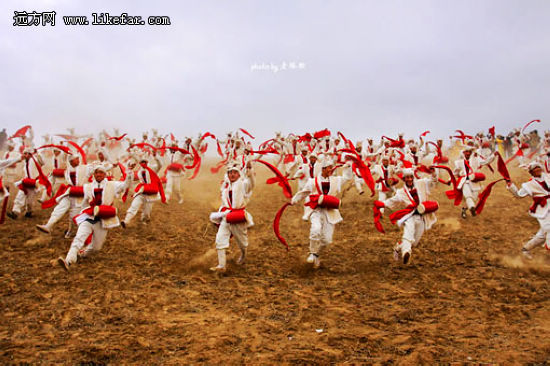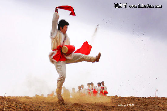 農歷正月里是看安塞腰鼓最好的時間,尤其是元宵節前后。其他時間,表演腰鼓的老鄉們不是在外地演出,就是在田間地頭忙農活,只有春節才是他們真正一展身手的時候!當厚重的土地被騰躍的千百漢子踢轉出漫天的黃沙,才能讓觀者體會出這古老藝術真正的生命力之所在。
