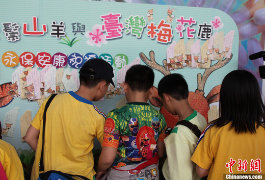 4月7日,臺北市立動物園為臺灣同胞回贈大陸同胞的長鬃山羊(“喜羊羊”和“樂羊羊”)和梅花鹿(“繁星”和“點點”)舉行祈福活動,它們即將在16日啟程赴山東劉公島。這場名為“永保安康——為長鬃山羊與梅花鹿祈福”的活動吸引了近百名幼兒園小朋友和小學生參加。圖為小朋友們把祝福卡片貼在祝福版上。路梅 攝