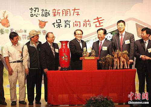 臺灣同胞贈送給大陸同胞的長鬃山羊和梅花鹿將于16日早上8點從臺北啟程赴山東劉公島定居,臺北市立動物園15日為兩對動物寶貝舉行歡送儀式。大陸“迎親團”由威海市常務副市長趙熙殿(右3)等10人組成。圖為臺北市與威海市互贈紀念品。中新社發 路梅 攝